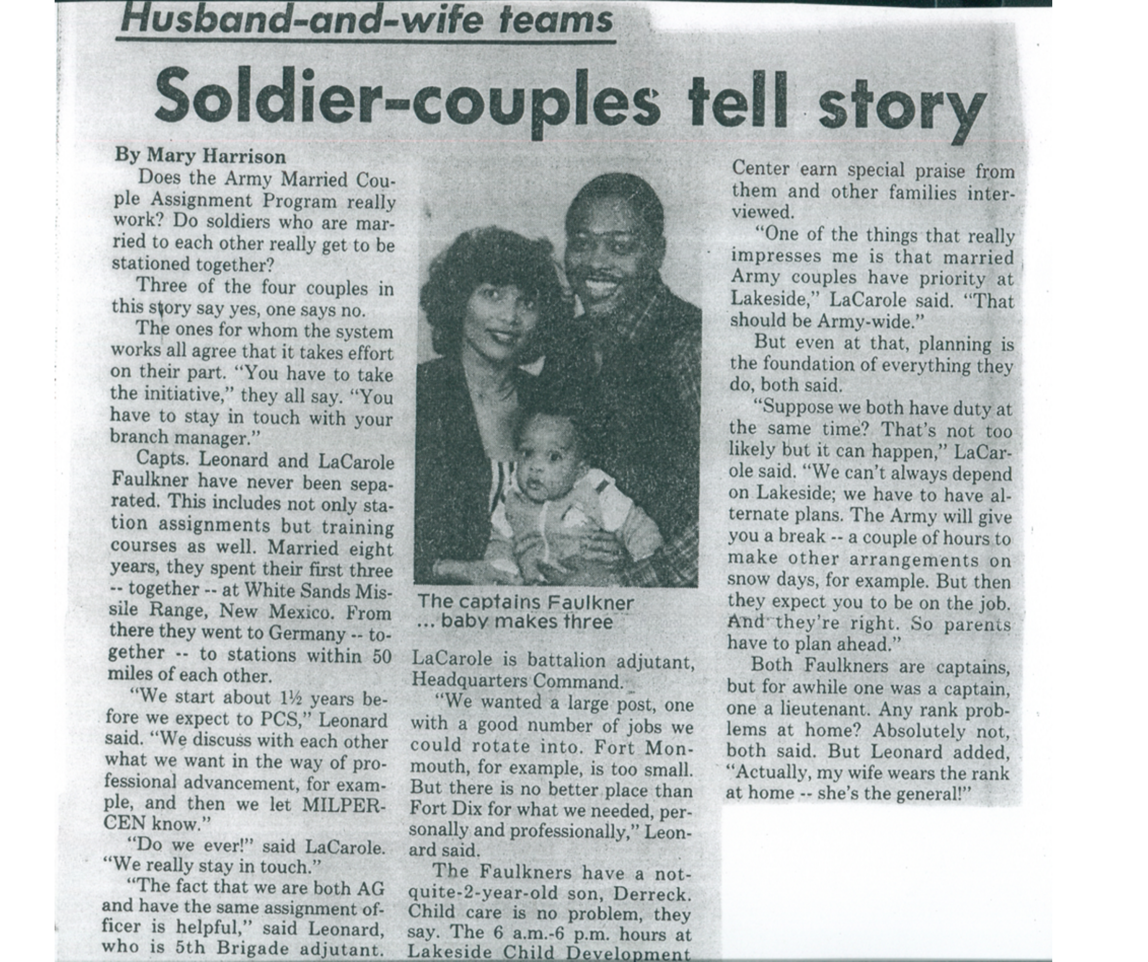LaCarole and Leonard Faulkner as one of the early success stories of the Army’s Married Couple Assignment Program. The initiative kept dual-military spouses stationed and working together while providing housing support and additional pay. As Captains raising their first child, they proved that military service and family life could grow together as parents’ serving in uniform.